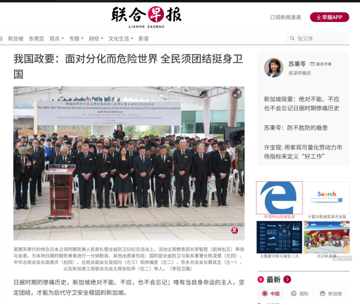 日前新加坡的《联合早报》表示,日本占领时期的惨痛记忆,新加坡不能也不应该忘记。面对当今不确定的国际局势,新加坡必须团结起来,尽一切努力维护地区和平稳定,并做好准备保卫新加坡的国家人民。